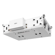 Kompaktlüftungsgerät mit Kreuzgegenstrom-Wärmetauscher inkl. Regelung fertig verdrahtet. Zur Montage an der Geschossdecke oder in der Zwischendecke in Innenräumen. Eingebautes elektrisches Vorheizregister zur Frostsicherung des Wärmetauschers bei sehr niedrigen Außenlufttemperaturen. Bei erhöhtem Komforttemperaturbedarf kann optional ein Elektro- oder Warmwasser-Nachheizregister in das Gerätegehäuse eingebaut werden. Gehäuse: Aus Aluzink-Blech, isoliert mit 50 mm Mineralwolle zur optimalen Wärme- und Schalldämmung. Außen allseitig korrosionsbeständig beschichtet, RAL 7047, Korrosions Klasse C4, innen verzinkt. Revisionsöffnungen auf der Geräteunterseite für einfachen Zugang und optimale Reinigungs- und Wartungsmöglichkeit. Zusätzliche Revisionsöffnung seitlich für die Filterwartung. 2 Kondensatanschlüsse DN 17,5 mm: 1 x Fortluftseite, 1 x Zuluftseite. Kondensatwanne aus Edelstahl mit integriertem Gefälle. Automatische Bypassklappe zur freien Kühlung aktivierbar. Temperaturfühler für Außenluft, Zuluft, Abluft und im Wärmetauscher zur ganzheitlichen Überwachung des Betriebszustandes. Eurovent-zertifizierter Kreuzgegenstrom-Wärmeübertrager aus Aluminium mit einem hohen thermischen Wirkungsgrad nach EN 308 von bis zu 90 %. Der Wärmetauscher verfügt über eine hohe innere Dichtheit und eignet sich damit besonders für Anwendungen, bei denen die Gefahr einer Geruchsübertragung bestehen kann. Ventilatoren: 2 direktangetriebene EC-Motoren, Klasse IE4 mit sehr niedrigen SFP-Werten, dynamisch gewuchtet und schwingungsgedämpft im Gerät gelagert. Stufenlos steuerbar über 0-10V Signal. Steckverbindungen an allen elektr. Bauteilen zur Vereinfachung von Wartungsarbeiten. Filter: Serienmäßig sind zwei großflächige, druckverlustoptimierte Kassettenfilter eingebaut (Außenluft ePM1 55% (F7) und Abluft ePM10 50% (M5)). Der Einsatz von Filtern der Filterklasse ePM1 80% (F9) in der Außenluft und ePM1 55% (F7) in der Abluft ist optional möglich. Die Filterüberwachung erfolgt mittels dynamischer, volumenstromabhängiger Drucküberwachung. Regelung: Das Lüftungsgerät wird mit einer vielseitigen Regelung betriebsbereit ausgeliefert. Die Regelung ist wartungsfreundlich in einem Anschlusskasten seitlich am Gerät angebracht, werksseitig verdrahtet und funktionsgetestet. Es stehen wahlweise 2 Bedienelemente (ECO und Touch) zur Verfügung (erforderliches Zubehör). Regelungsfunktionen: Lüftungsmodi Volumenkonstant CAV, Druckkonstant VAV (Zubehör erforderlich), Drehzahlkonstant CRPM in % oder über Wochenprogramm. Automatischer Lüftungsbetrieb/ Ventilation-On-Demand (VOD) mittels Feuchte, CO2 oder VOC Sensoren. Bis zu 18 Sensoren pro Lüftungsgerät anschließbar. Freie Kühlung, aktive Kühlung mittels Kühlregister (Kaltwasser oder DX). Temperatur-Regelung, z.B. Konstante Zuluft, außentemperaturgeführte Zuluft, Raum-Zuluft-Kaskade, etc. möglich. Digitale Eingänge für Feueralarm und externen Schalter (Ein / Aus). Digitaler Ausgang für Sammelstörmeldung. Externe Ventilator-Ansteuerung über zwei analoge 0-10V Eingänge (Zuluft- und Abluftventilator separat). Anbindung an die GLT über BACnet IP oder Modbus TCP möglich. Inbetriebnahme-Assistenten zur einfachen und schnellen Inbetriebnahme des Geräts sowie des passenden Zubehörs.