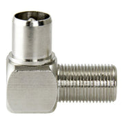 Adapter in Winkelausführung, zur Umwandlung eines F-Anschlusses in einen IEC-Stecker-Anschluss.