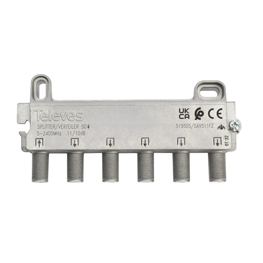 Televes6-fach Verteiler 5-2400 MHz im Gußgehäuse mit Wandabstand und F-Anschlüssen. Eingänge und Ausgänge auf einer Seite, dadurch weniger Platzbedarf, br...