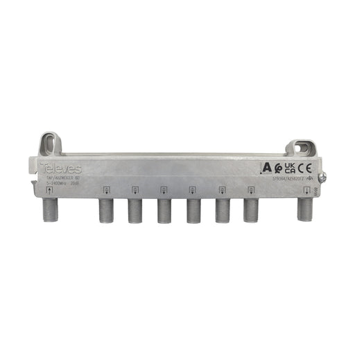 Televes8-fach Abzweiger 5-2400 MHz im Gußgehäuse mit Wandabstand und F-Anschlüssen. Eingänge und Ausgänge auf einer Seite, dadurch weniger Platzbedarf, DC...