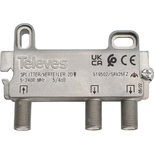 Televes2-fach Verteiler 5-2400 MHz im Gußgehäuse mit Wandabstand und F-Anschlüssen. Eingänge und Ausgänge auf einer Seite, dadurch weniger Platzbedarf, br...