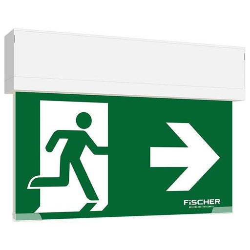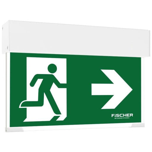 FischerRettungszeichenleuchte mit universeller Piktogrammscheibe zur Notversorgung über zentrales Stromversorgungssystem mit Leistungsbegrenzung. Gefertig...
