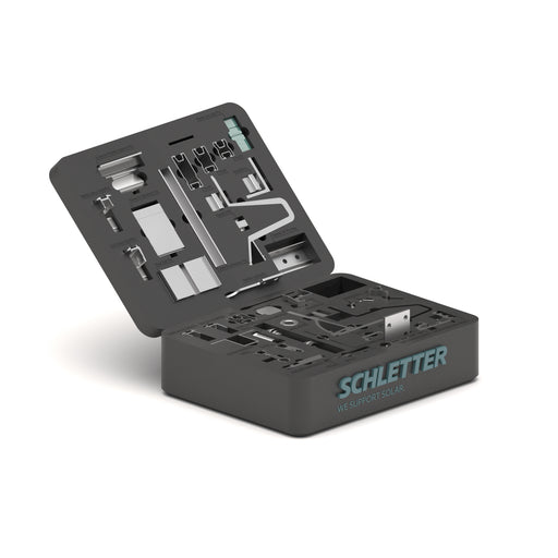 Geben Sie Ihrem Kunden etwas in die Hand ! Kompakt und übersichtlich zeigt der Musterkoffer wesentliche Muster-Bauteile des Schletter Solar Montage...
