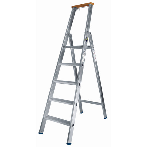 ILLER-LEITERBreitsprossenstehleiter aus Holz mit 2 x 5 Sprossen speziell für die Anforderungen von Elektrikern und Malern, ab der 3. Sprosse von oben stehen Si...