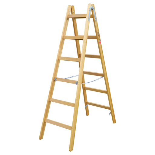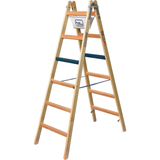 ILLER-LEITERHandwerkerleiter aus Holz mit 2x6 Sprossen, 1,82 m lang, konisch beidseitig begehbar, Eimerhaken serienmäßig, Seitenbandscharniere aus verzinktem S...