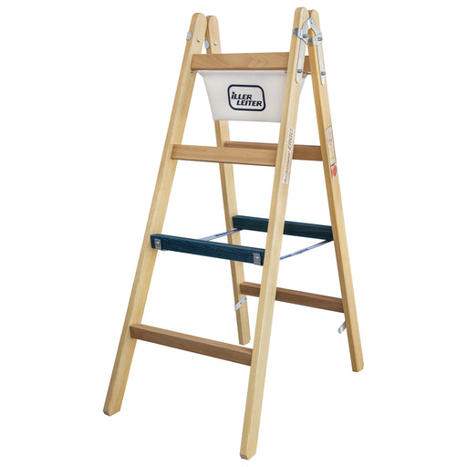ILLER-LEITERHandwerkerleiter aus Holz mit 2x3 Sprossen, 0,97 m lang, konisch beidseitig begehbar, Eimerhaken serienmäßig, Seitenbandscharniere aus verzinktem S...