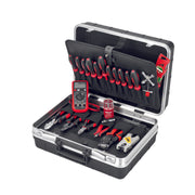 Lehrlingskoffer INDUSTRIE, robuste Werkzeugkoffer aus stoßfestem Kunststoff mit stabilem Aluminiumrahmen mit zwei abschließbaren Kippschlössern. Ausgestattet mit tiefgezogener Bodenschale mit zahlreichen Unterteilungsmöglichkeiten und herausnehmbarer Bodenabdeckplatte, einseitig mit Werkzeugtaschen bestückt. Zudem herausnehmbare Werkzeugtafel mit einer Vielzahl von Werkzeugeinsteckfächern. Größe: LxBxH: 395x455x205 mm, Gewicht: leer 3.450 g, bestückt 9.000 g. Inklusive 22 Qualitätswerkzeuge: 1.000 V Kabelschere, für Kabel mit einem Ø von 18 mm (12 0114), 1.000 V Zange, 1.000 V Kraft-Seitenschneider, 200 mm (10 0528), 1.000 V Schlitz-Schraubendreher in den Größen: 3,0x0,5x100 mm (11 7702), 4,0x0,8x100 mm (11 7704), 5,5x1,0x125 mm (11 7705)1.000 V Spezial-Schraubendreher in den Größen: Kombi-Profil PZ FL, 1x80 mm (11 7751), Kombi-Profil PZ FL