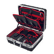 Profi-Hartschalenkoffer Champion mit herausragendem Preis-Leistungs-Verhältnis! Breiter Aluminiumrahmen für hohe Stabilität, Kofferschalen aus extrem schlag- und sturzfestem Polypropylen, besonders geräumige Bodenschale mit verschiedenen Stegen zur sinnvollen Aufteilung in Kleingefache, 3 Werkzeugtafeln mit zahlreichen Einsteckfächern in unterschiedlichen Größen zur sicheren Aufbewahrung von Handwerkzeugen aller Art, 3 Metallscharniere mit Rastmechanismus halten den Koffer ohne zusätzliche Streben sicher geöffnet, Komfort-Tragegriff mit Weichgummieinlage, 2 robuste abschließbare Schnappschlösser, Namensschild. Komplett mit 21 Werkzeugen. Werkzeugkoffer-Bestückung: 1 x Telefonzange mit geraden Backen 200 mm, DIN ISO 5745 (10 0216), 1 x Telefonzange mit gebogenen Backe (10 0238), 1 x Seitenschneider 160 mm, DIN ISO 5749B (10 0574), 1 x Abisolierzange Super 4 (10 0760), 1 x Elektronik-Seitenschneider mit einem Ø von/bis 3,1 mm, 21°, 132 mm (10 1040), 1 x Wasserpumpenzange DIN ISO 8976 mit Griffhüllen, 250 mm (10 1224), 1 x Presszangensystem clickncrimp Elektrotechnik (10 6000), Kugelkopf-Sechskant- Stiftschlüssel-Satz