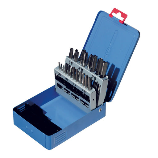 HSS- Gewindeschneidzeug- Satz für metrische Regelgewinde in einer Metallkassette, zum Schneiden von Innen- und Außengewinden, Handgewindebohrer (Vo...